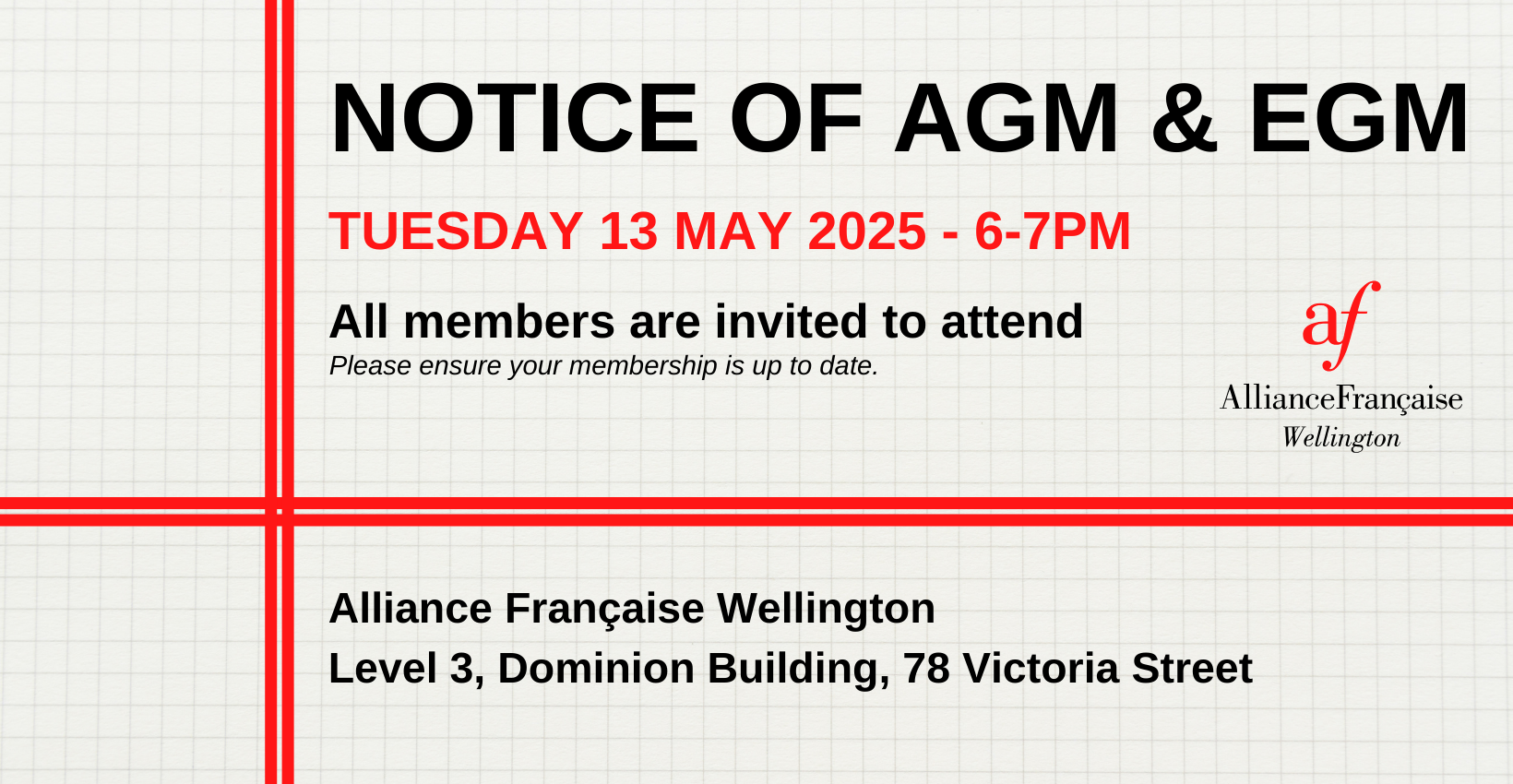 Both the AGM and the EGM will be held at the premises of the Alliance Française, Level 3, Dominion Building, 78 Victoria Street, Wellington from 6.00pm to 7.00pm on Tuesday 13 May 2025. Come along and influence the future direction of your Alliance Française. We would love to hear your ideas. Light refreshments will be served at the conclusion of the EGM.