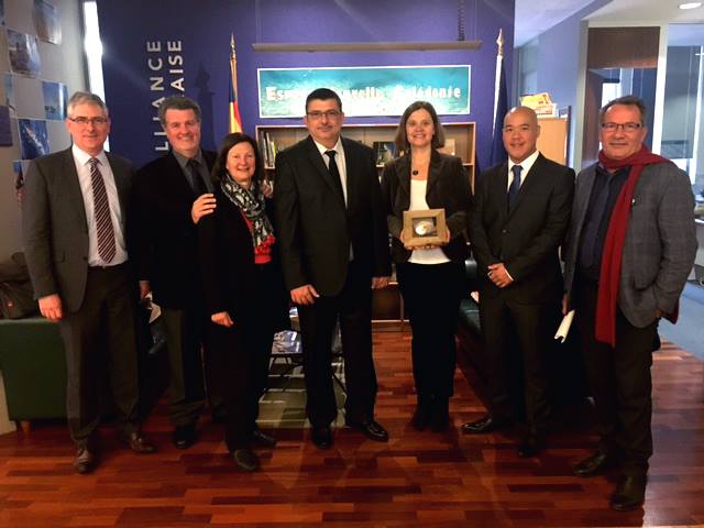 Yves Lafoy (Official Representative of New Caledonia to New Zealand), Dominique Santini (Alliance Française Treasurer), Adrienne Bushell (Alliance Française President), Philippe Germain (President of the government of New Caledonia) Nathalie Dourneau (Alliance Française Director), Cédric Chan Yone (Counsellor in charge of Francophonie) Jean-Louis d’Anglebermes (Vice-President of the government of New Caledonia)